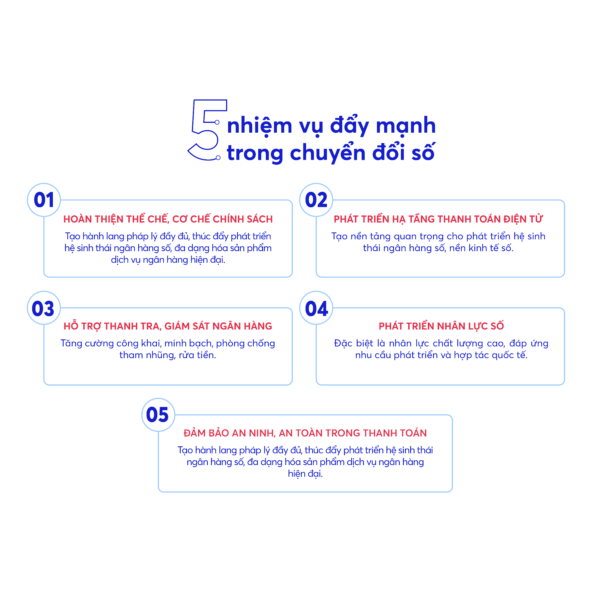 Năm nhiệm vụ trọng tâm được Thủ tướng Chính phủ Việt Nam nêu Tại sự kiện Ngày Chuyển đổi số ngành ngân hàng năm 2024. Nội dung được trích từ báo cáo “Sự chuyển dịch sang tài chính số bền vững của ngành ngân hàng – tài chính tại Việt Nam” do MB phát hành tháng 9.2024
